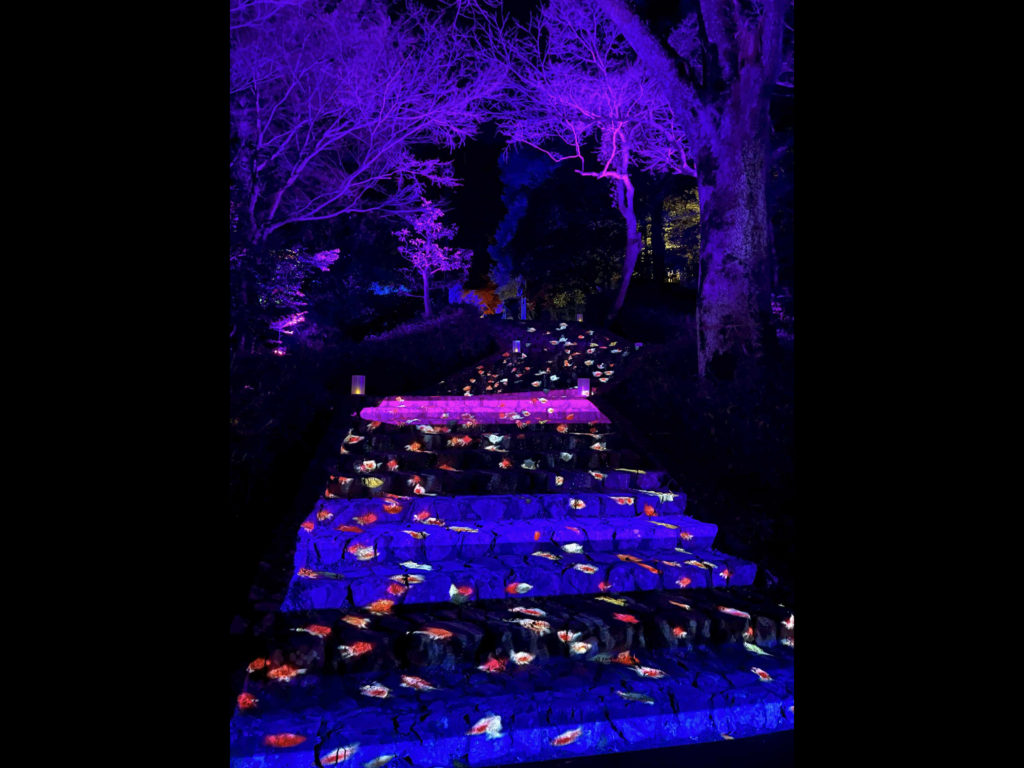 岐阜公園エリアでは、冠木門前に鯉が優雅に泳ぐ池を、階段や通路には縁日の賑わいをモチーフとした色鮮やかな映像を投影した他、