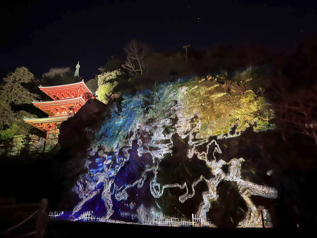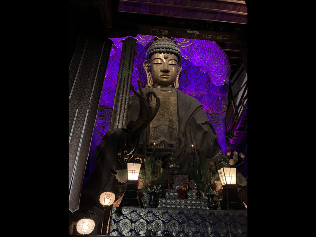 正法寺エリアでは、建物全体をライトアップし、岐阜大仏の背景にカラーライティングを施しました。